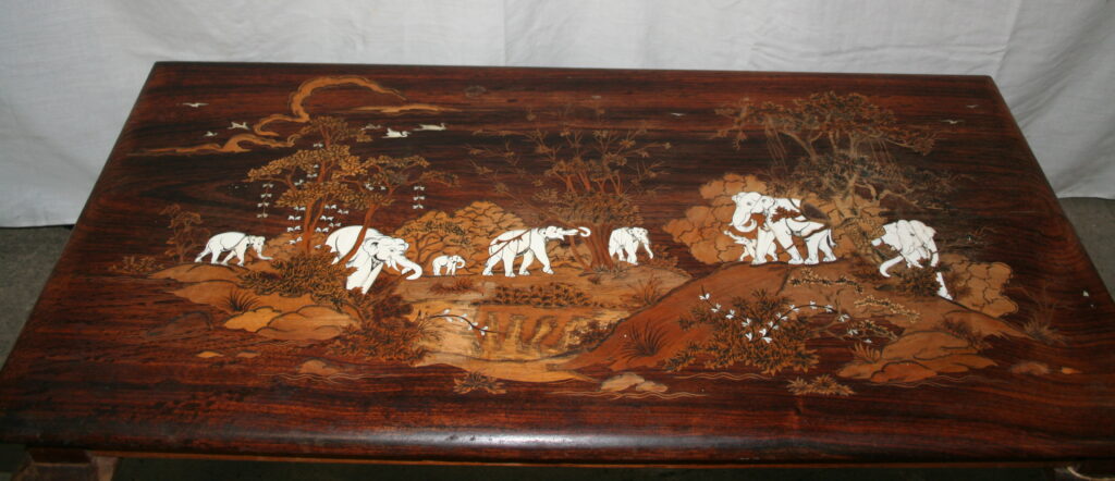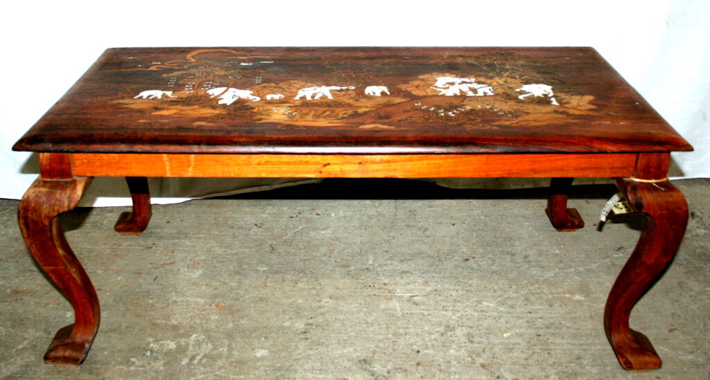 Teakwood Coffee Table with Bone Inlaid Elephants Top